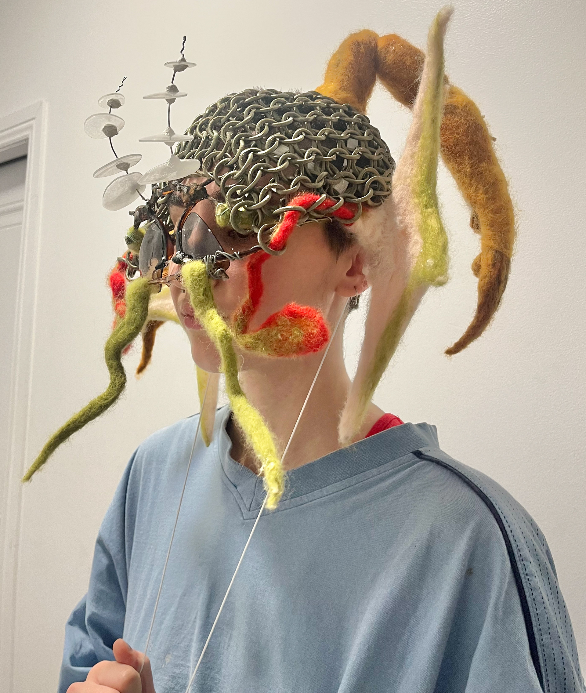needle felting, 3D printed chainmail, wire, glasses frames, shrinky dinks, clay, embroidery, boning. antenna lifting system by handheld string.